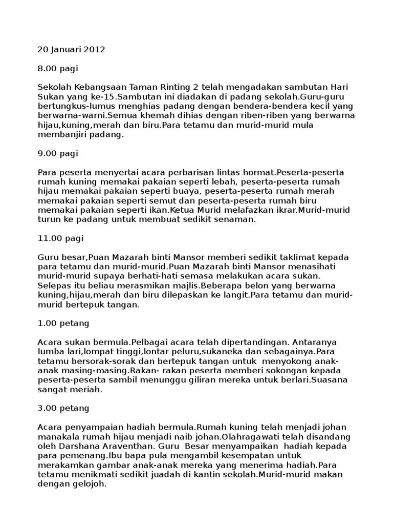Contoh Karangan Catatan Harian Cuti Sekolah / Karangan Jenis Catatan Karangan Jenis Catatan Sambutan Hari Guru. Catatan harian diari terbahagi kepada dua jenis iaitu. Tulis catatan tentang perkhemahan ini. Tulis catatan harian tentang aktiviti kamu itu. Pada cuti sekolah yang lalu kami sekeluarga pergi berkelah. Sebagai contoh sekolah perlu diwajibkan mengadakan program bahasa sempena bulan . Kamu telah melakukan beberapa aktiviti sempena cuti persekolahan yang lalu. Pada cuti sekolah yang lalu bapa saya membawa kami sekeluarga.